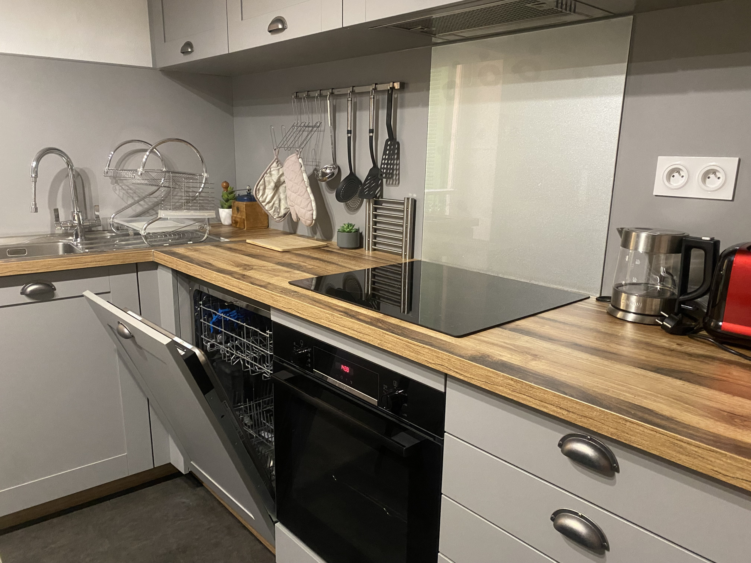 Il tuo alloggio dispone di una camera da letto, bagno con vasca, servizi igienici separati, soggiorno e cucina completamente attrezzata (lavastoviglie, macchina da caffè, forno, microonde...)